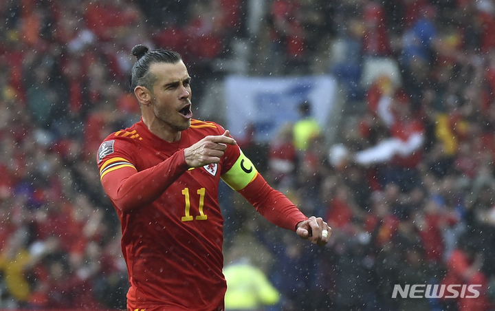 [카디프=AP/뉴시스] 웨일스의 개러스 베일이 5일(현지시간) 웨일스 카디프의 카디프 시티 스타디움에서 열린 우크라이나와의 2022 카타르 월드컵 유럽예선 플레이오프(PO) 결승전 전반 34분 프리킥으로 상대 자책골을 얻어낸 후 환호하고 있다. 웨일스가 우크라이나를 1-0으로 제압하고 64년 만에 월드컵 본선에 진출했다. 2022.06.06.