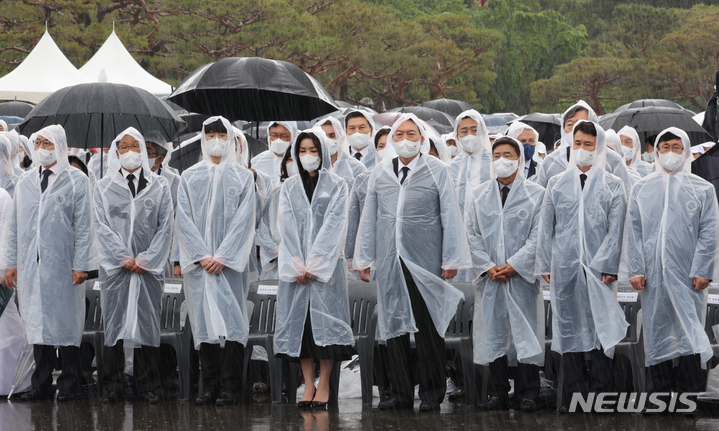 [서울=뉴시스] 전신 기자 = 윤석열 대통령과 부인 김건희 여사를 비롯한 참석자들이 6일 서울 동작구 국립서울현충원에서 열린 제67회 현충일 추념식에서 애국가를 부르고 있다. (대통령실통신사진기자단). 2022.06.06. [email protected]