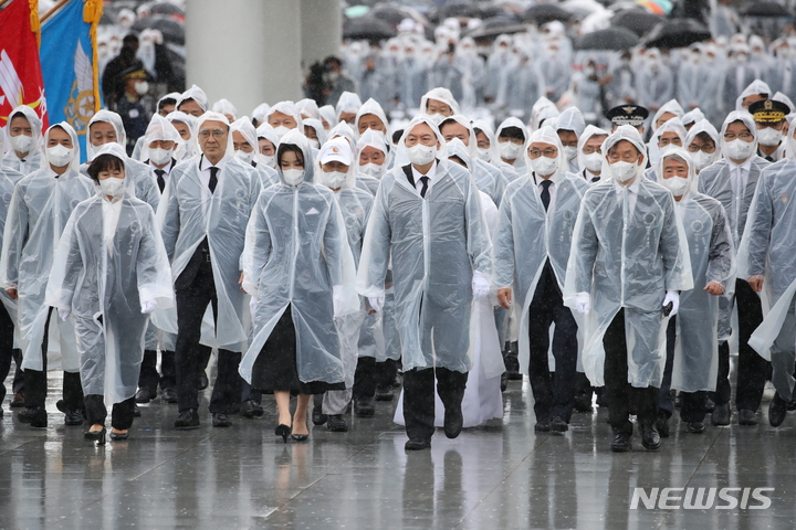 [서울=뉴시스] 전신 기자 = 윤석열 대통령과 부인 김건희 여사를 비롯한 참석자들이 6일 서울 동작구 국립서울현충원에서 열린 제67회 현충일 추념식에서 현충탑에 현화, 분향을 위해 이동하고 있다. (대통령실통신사진기자단). 2022.06.06. [email protected]