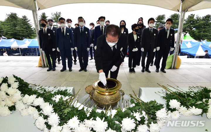 [대구=뉴시스] 이무열 기자 = 홍준표 대구시장 당선인이 6일 오전 대구 남구 대명동 충혼탑에서 열린 제67회 현충일 추념식에서 분향을 하고 있다.2022.06.06. [email protected]