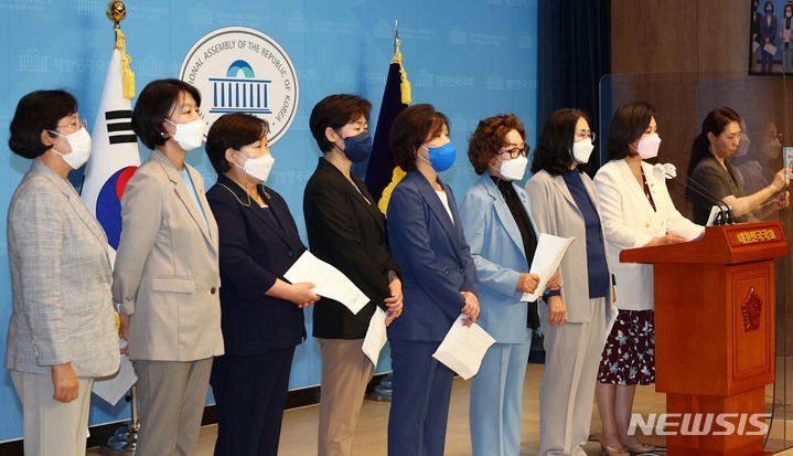 [서울=뉴시스] 고범준 기자 = 이수진 민주당 국회의원 등 '민주당의 쇄신을 위한 여성모임'이 7일 서울 여의도 국회 소통관에서 기자회견을 갖고 전당대회를 앞둔 더불어민주당의 철저한 반성과 쇄신을 요구하는 기자회견을 하고 있다. (공동취재사진) 2022.06.07. [email protected]
