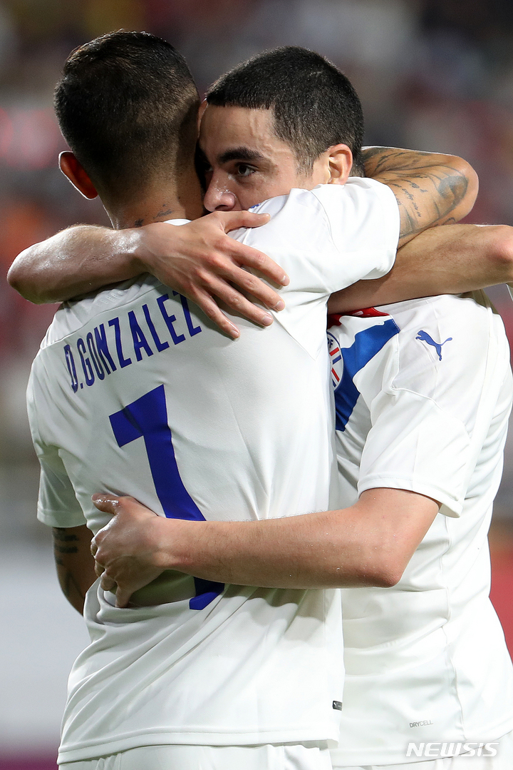 [서울=뉴시스] 백동현 기자 = 10일 오후 경기 수원시 수원월드컵경기장에서 열린 하나은행 초청 축구 국가대표팀 평가전 대한민국과 파라과이 경기, 파라과이 미구엘 알미론이 득점 후 동료들과 기뻐하고 있다. 2022.06.10. [email protected]