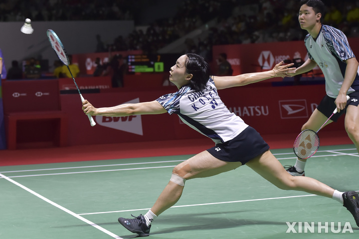 [자카르타=신화/뉴시스] 서승재-채유정이 10일(현지시간) 인도네시아 자카르타 이스토라 세나얀에서 열린 2022 인도네시아 마스터스(월드투어 슈퍼500) 혼합복식 8강전 왕이류-황동핑(중국)과 경기하고 있다. 한국이 세트스코어 2-1(19-21 21-10 21-14)로 중국을 꺾고 준결승에 진출해 젱시웨이-황야총(중국)과 결승행을 다툰다. 2022.06.11.