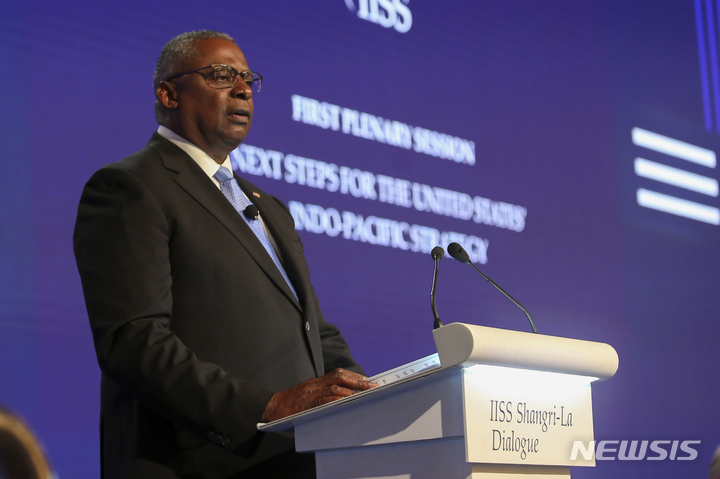 [싱가포르=AP/뉴시스] 로이드 오스틴 미 국방장관이 11일 싱가포르에서 열리고 있는 제19차 아시아안보회의(샹그릴라 대화)에 참석해 연설하고 있다. 오스틴 장관은 "북한의 상습 도발과 미사일 시험 발사는 우리 임무의 시급성을 강조할 뿐"이라며 "그래서 한·미·일 간 안보 협력을 심화하고 있다"라고 말했다. 2022.06.11.