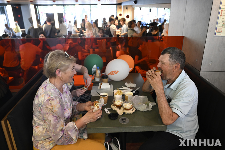 [모스크바=신화/뉴시스] 12일(현지시간) 러시아 모스크바 중심부의 옛 맥도날드 매장에 새로 개점한 패스트푸드 음식점 '브쿠스노 이 토치카'에서 사람들이 식사하고 있다. '브쿠스노 이 토치카'는 미국의 맥도날드가 러시아에서 철수한 후 모스크바 등지에 15개 매장을 열었다. 2022.06.13.