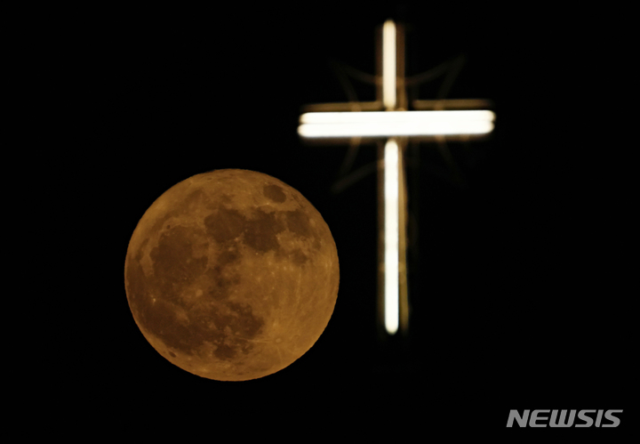 [바그다드=AP/뉴시스] 14일(현지시간) 이라크 바그다드의 성 요셉 교회 십자가 부근에 슈퍼문이 떠오르고 있다. 달이 지구와 가까워 발생하는 '슈퍼문' 보름달은 6월에는 '스트로베리 문'(Strawberry Moon)이라고도 불린다. 2022.06.15.
