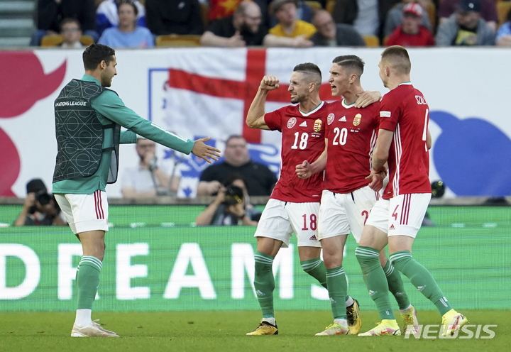[울버햄프턴=AP/뉴시스] 헝가리의 롤란드 살라이(오른쪽 두 번째)가 14일(현지시간) 영국 울버햄프턴의 몰리뉴 스타디움에서 열린 2022~23 유럽축구연맹(UEFA) 네이션스리그 그룹A 3조 잉글랜드와의 4차전 팀의 두 번째 골을 넣고 동료들과 기뻐하고 있다. 헝가리가 잉글랜드를 4-0으로 꺾어 2승1무1패로 조 1위로 올라섰다. 2022.06.15.
