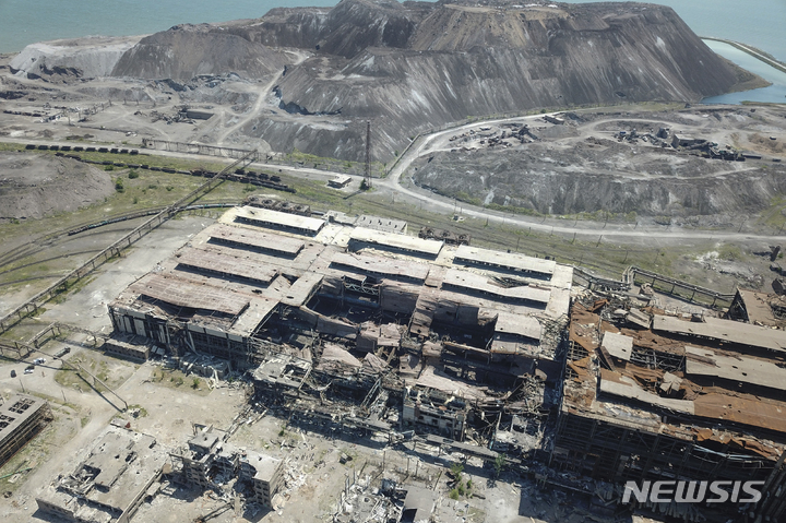 [마리우폴=AP/뉴시스] 러시아 국방부가 13일(현지시간) 공개한 사진에 우크라이나 동부 도네츠크인민공화국(DPR) 통제하에 있는 마리우폴에 아조우스탈 제철소가 보인다. 이 제철소는 마리우폴 포위전 동안 거의 완전히 파괴됐다. 2022.06.15.