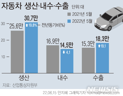[서울=뉴시스] 15일 산업통상자원부에 따르면 지난달 자동차 생산 대수는 전년 동월 대비 19.8% 증가한 30만7048대로 집계됐다. 수출 대수는 전년 동월 대비 19.1% 증가한 18만2869대로 집계됐다. 수출 금액은 18.9% 증가한 41억5000만 달러로 물량과 금액 모두 두 자릿수 증가율을 기록했다. (그래픽=안지혜 기자)