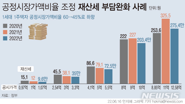 [서울=뉴시스] 정부가 1가구 1주택 실수요자의 재산세 공정시장가액비율을 60%에서 45%로 하향 조정한다. 정부 방침에 따른 완화 사례를 보면 공시가 3억3000만원 주택은 41만9000원에서 35만원, 5억5000만원 주택은 87만원에서 72만5000원,세금 납부 금액이 적어진다. (그래픽=안지혜 기자)