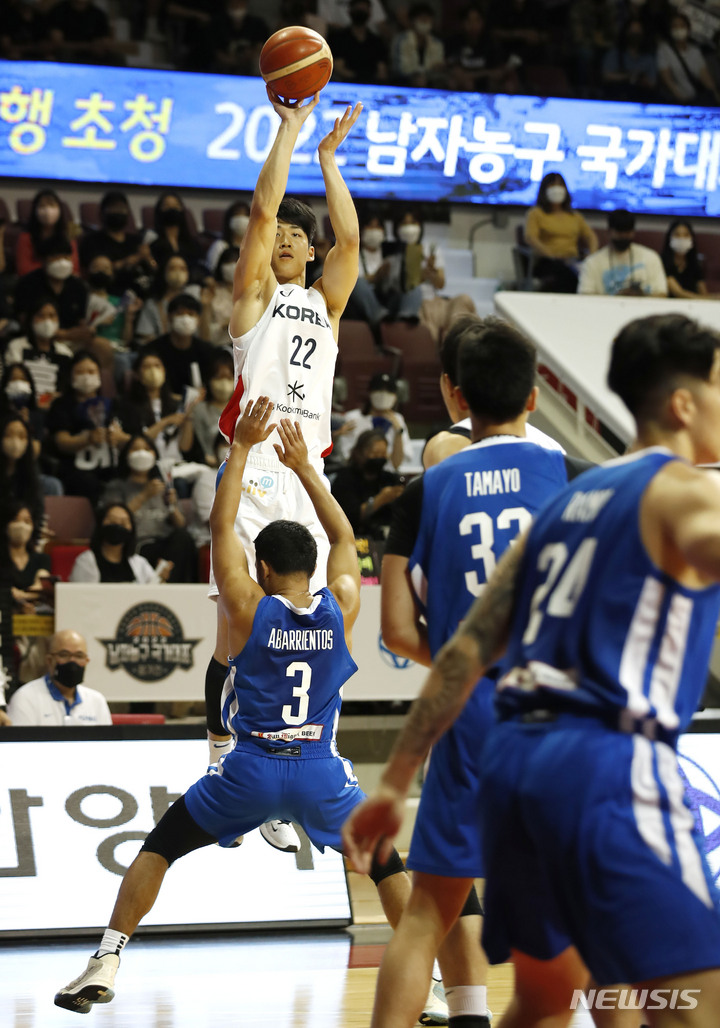 [안양=뉴시스] 정병혁 기자 = 17일 오후 경기 안양시 안양실내체육관에서 열린 KB국민은행 초청 2022 남자농구 국가대표 평가전 대한민국과 필리핀의 경기, 대한민국 여준석이 슛을 하고 있다. 2022.06.17. [email protected]