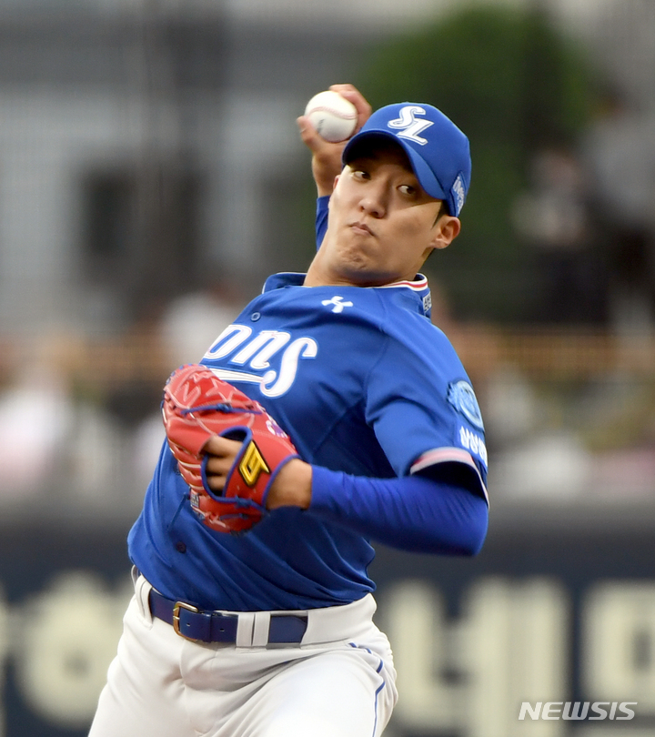 [광주=뉴시스] 류형근 기자 = 17일 오후 광주 북구 광주-기아챔피언스필드에서 열린 2022프로야구 삼성 라이온즈 대 KIA 타이거즈의 경기, 1회말 무사에서 삼성 선발투수 원태인이 역투하고 있다. 2022.06.17. [email protected]