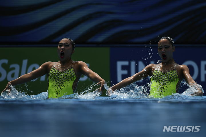 [부다페스트=AP/뉴시스] 허윤서와 이리영이 17일(현지시간) 헝가리 부다페스트의 알프레드 허요시 수영 콤플렉스에서 열린 2022 국제아마추어수영연맹(FINA) 세계수영선수권대회 아티스틱스위밍 듀엣 테크니컬 부문에 출전해 경기하고 있다. 이들은 80.6840으로 12위를 기록하며 현 점수체계 도입 이후 처음으로 결승에 진출했다. 2022.06.18.
