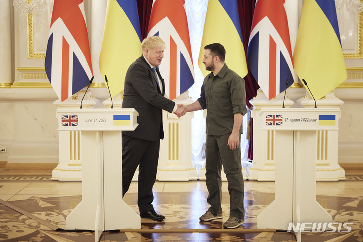 [키이우=AP/뉴시스] 볼로디미르 젤렌스키(오른쪽) 우크라이나 대통령과 보리스 존슨 영국 총리가 17일(현지시간) 키이우에서 공동 기자회견을 마친 후 악수하고 있다. 두 정상은 중화기와 방공 시스템 등의 군사 지원과 경제적 지원, 러시아 제재 강화 등을 논의한 것으로 알려졌다. 2022.06.18.