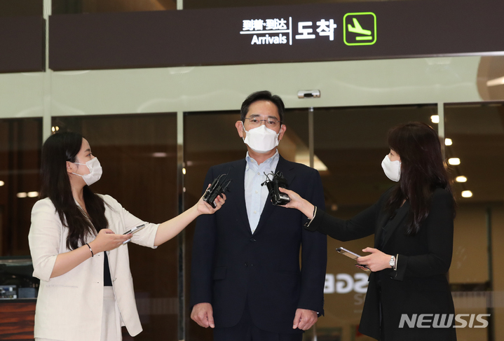 [서울=뉴시스] 고승민 기자 = 유럽 출장을 마친 이재용 삼성전자 부회장이 18일 서울김포비즈니스항공센터를 통해 귀국하고 있다. 2022.06.18. [email protected]