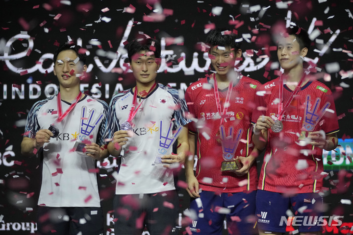 [자카르타=AP/뉴시스] 최솔규(왼쪽)-김원호가 19일(현지시간) 인도네시아 자카르타에서 열린 국제배드민턴연맹(BWF) 월드투어 슈퍼 1000시리즈 인도네시아 오픈 남자복식에서 준우승, 시상대에 올라 기념 촬영을 하고 있다. 이들은 결승전에서 리우유첸-오우슈안이(중국)에 0-2(17-21 21-23)로 지며 은메달을 목에 걸었다. 2022.06.20.