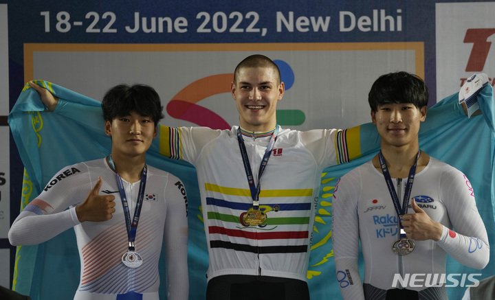 [뉴델리=AP/뉴시스] 배우 라미란의 아들 김근우(왼쪽)가 20일(현지시간) 인도 뉴델리에서 열린 제28회 주니어 아시아 트랙 사이클 선수권 남자 1㎞ 타임트레일 경기에서 은메달을 딴 후 시상대에 올라 기념 촬영을 하고 있다. 김근우는 18일에도 스프린트 단체전에서도 금메달을 딴 바 있다. 2022.06.21.