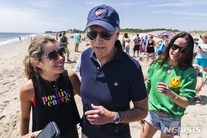 [레호보스 비치=AP/뉴시스] 조 바이든 미국 대통령이 20일(현지시간) 델라웨어주 서식스 카운티의 레호보스 비치에서 손녀 나탈리(왼쪽), 딸 애슐리와 해변을 산책하던 중 기자들에게 말하고 있다. 바이든 대통령은 치솟는 휘발유 가격 부담을 덜어주기 위해 유류세 한시 면제를 검토하고 있다고 밝혔다. 2022.06.21.