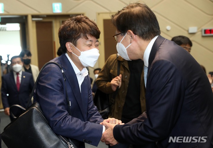 [부산=뉴시스] 하경민 기자 = 이준석 국민의힘 당 대표가 24일 부산 동구 부산항국제전시컨벤션센터 컨벤션홀에서 열린 '부산 지방선거 당선자 워크숍'에 참석, 박형준 부산시장과 악수하고 있다. 2022.06.24. [email protected]