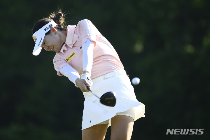[베데스다=AP/뉴시스] 전인지가 24일(현지시간) 미 메릴랜드주 베데스다의 콩그레셔널CC에서 열린 LPGA투어 KPMG위민스 PGA챔피언십 2라운드 18번 홀에서 티샷하고 있다. 전인지는 중간 합계 11언더파 133타로 단독 선두를 유지하고 있다. 2022.06.25.