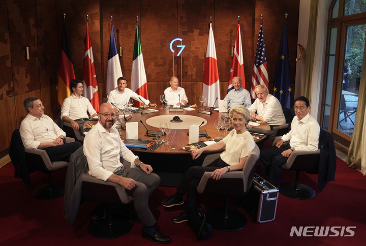 [크루엔=AP/뉴시스] 주요 7개국(G7) 정상회의가 26일(현지시간) 독일 크루엔의 엘마우성에서 개막한 가운데 G7 정상이 만찬을 위해 모여 있다. 왼쪽부터 시계방향으로 샤를 미셸 유럽이사회 의장, 마리오 드라기 이탈리아 총리, 쥐스탱 트뤼도 캐나다 총리, 에마뉘엘 마크롱 프랑스 대통령, 올라프 숄츠 독일 총리, 조 바이든 미국 대통령, 보리스 존슨 영국 총리, 기시다 후미오 일본 총리, 우르줄라 폰데어라이엔 유럽연합 집행위원장. 2022.06.27.