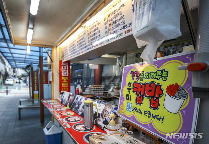 [서울=뉴시스] 정병혁 기자 = 물가 상승 등의 이유로 재료비가 오르면서 컵밥 가격도 오른 것으로 나타난 28일 오후 서울 동작구 노량진 컵밥거리에 위치한 한 점포에 컵밥 가격이 표시되어 있다. 2022.06.28. [email protected]