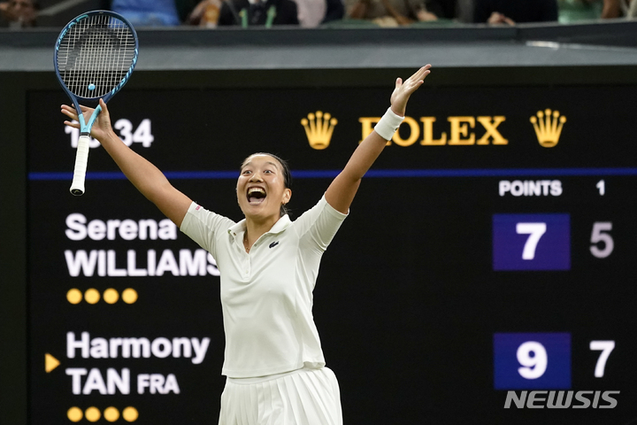[윔블던=AP/뉴시스] 하모니 탄(115위·프랑스)이 28일(현지시간) 영국 런던 윔블던의 올잉글랜드 론 테니스클럽에서 열린 2022 윔블던 테니스대회 여자단식 1회전에서 세리나 윌리엄스(1204위·미국)를 물리친 후 기뻐하고 있다. 탄은 3시간11분의 접전 끝에 2-1(7-5 1-6 7-6<10-7>)로 신승했다. 2022.06.29.