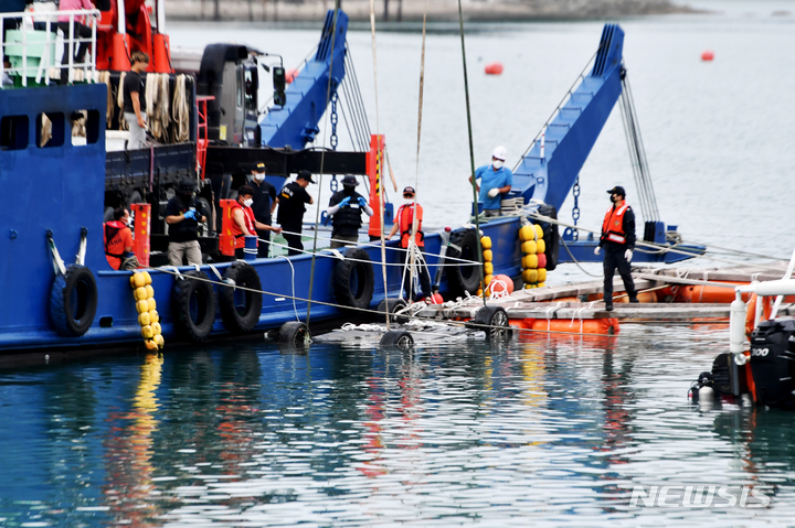 [완도=-뉴시스] 이영주 기자 = 29일 오전 전남 완도군 신지면 송곡항에서 실종된 조유나(10)양의 일가족이 탔던 차량이 뒤집힌 채 인양되고 있다. 2022.06.29. [email protected]