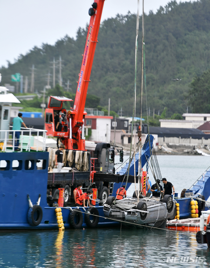 [완도=-뉴시스] 이영주 기자 = 29일 오전 전남 완도군 신지면 송곡항에서 실종된 조유나(10)양의 일가족이 탔던 차량이 인양되고 있다. 2022.06.29. [email protected]
