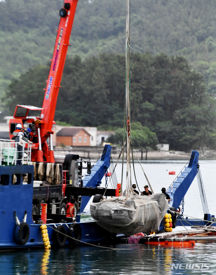 [완도=-뉴시스] 이영주 기자 = 29일 오전 전남 완도군 신지면 송곡항에서 실종된 조유나(10)양의 일가족이 탔던 차량이 그물망에 싸여진 채 인양되고 있다. 2022.06.29. [email protected]