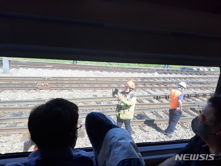 [서울=뉴시스]1일 오후 3시23분께 부산에서 수서역으로 향하던 SRT 열차가 대전조차장역 인근서 탈선했다. 이 열차에는 승객 380명이 탑승했으며 이 중 5명이 부상을 입고 인근 병원으로 이송돼 치료를 받고 있다. 2022.07.1 (사진 = 독자 제공)