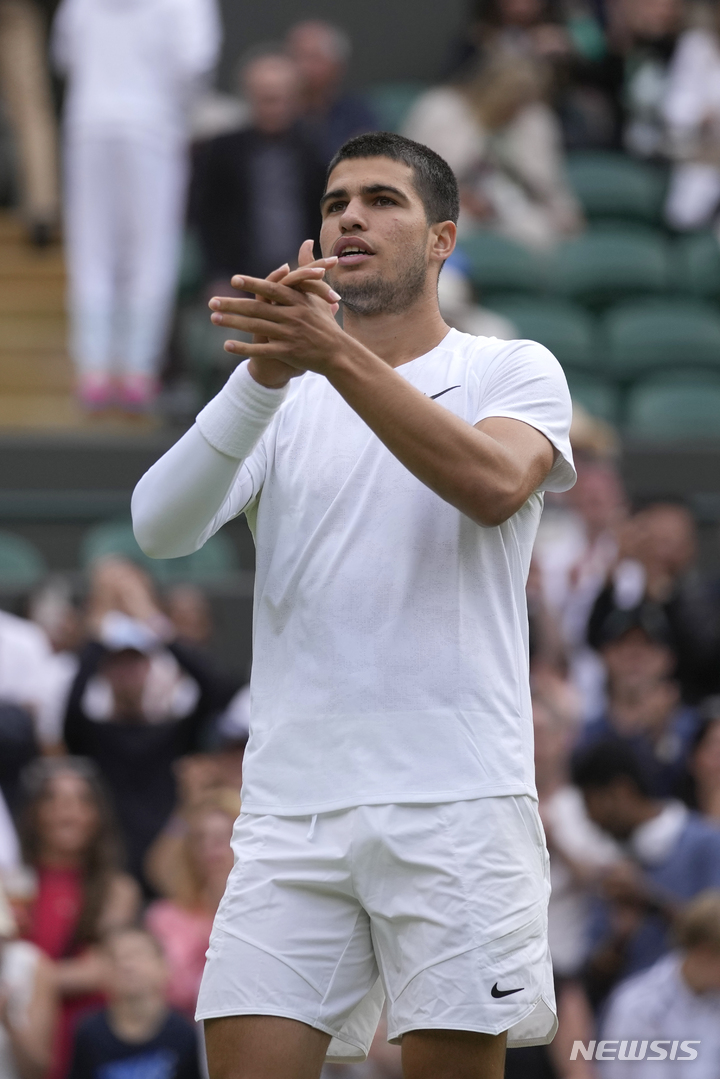 [윔블던=AP/뉴시스] 카를로스 알카라스(7위·스페인)가 1일(현지시간) 영국 윔블던의 올잉글랜드클럽에서 열린 윔블던 테니스 대회 남자 단식 3회전 오스카 오테(36위·독일)를 물리친 후 기뻐하고 있다. '제2의 나달' 알카라스는 오테를 1시간 38분 만에 3-0(6-3 6-1 6-2)으로 완파하고 16강에 진출했다. 2022.07.02.