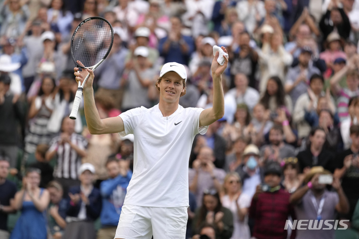 [윔블던=AP/뉴시스] 야닉 시너(13위·이탈리아)가 3일(현지시간) 영국 윔블던의 올잉글랜드클럽에서 열린 윔블던 테니스 대회 남자 단식 4회전 카를로스 알카라스(7위·스페인)를 물리친 후 기뻐하고 있다. 시너는 제2의 나달 알카라스를 3시간 35분 접전 끝에 3-1(6-2 4-6 6-1 6-2)로 꺾고 8강에 올라 노바크 조코비치를 만난다. 2022.07.04.