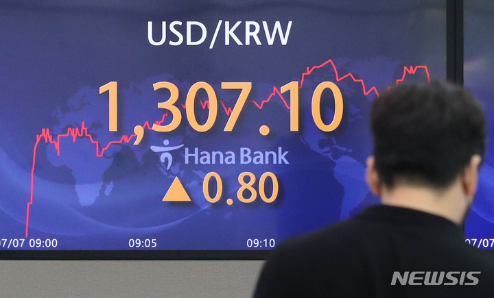 [서울=뉴시스] 권창회 기자 = 원·달러 환율이 전 거래일(1306.3원)보다 1.3원 내린 1305.0원에 개장한 7일 오전 서울 중구 하나은행 딜링룸 전광판에 환율이 표시되고 있다. 코스피는 전 거래일(2292.01)보다 16.96포인트(0.74%) 오른 2308.97, 코스닥 지수는 전 거래일(744.63)보다 6.35포인트(0.85%) 상승한 750.98에 출발했다. 2022.07.07. [email protected]