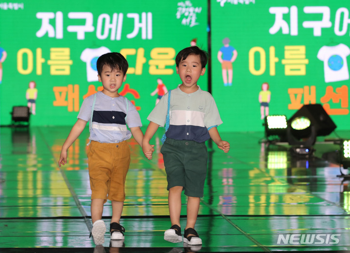 [서울=뉴시스] 권창회 기자 = 7일 오후 서울 중구 동대문디자인플라자 어울림광장에서 진행된 '지구에게 아름다운 패션쇼'에서 어린이 모델들이 폐플라스틱을 재활용한 섬유로 만든 옷을 입고 런웨이를 걷고 있다. 2022.07.07. [email protected]