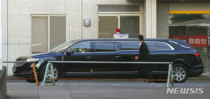 [가시하라=AP/뉴시스] 아베 신조 전 일본 총리의 시신이 실린 것으로 보이는 운구차가 9일 나라현 가시하라의 한 병원을 떠나고 있다. 8일 참의원 선거 관련 유세 중 총격으로 숨진 아베 신조 전 총리의 장례는 참의원 선거 개표 이후 진행될 것으로 알려졌다. 2022.07.09.