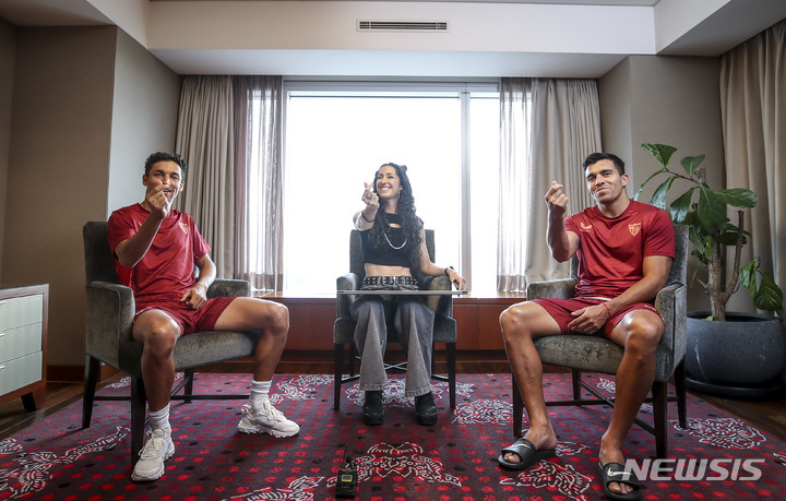 [서울=뉴시스] 정병혁 기자 = 세비야FC의 헤수스 나바스와 마르코스 아쿠냐가 9일 오후 서울 강남구 코엑스 인터콘티넨탈 호텔에서 열린 한국어 교실에서 내한한 세비야FC 선수들이 한국어를 배우고 있다. 2022.07.09. [email protected]