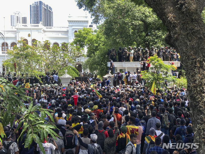 [콜롬보=AP/뉴시스] 13일(현지시간) 스리랑카 콜롬보 총리 공관 앞에서 시위대가 총리 퇴진을 요구하며 시위하고 있다. 대통령의 국외 도피에 분노한 시위대는 라닐 위크레메싱게 총리의 퇴진도 요구하고 있으며 스리랑카 정부는 국가 비상사태를 선포했다. 2022.07.13.