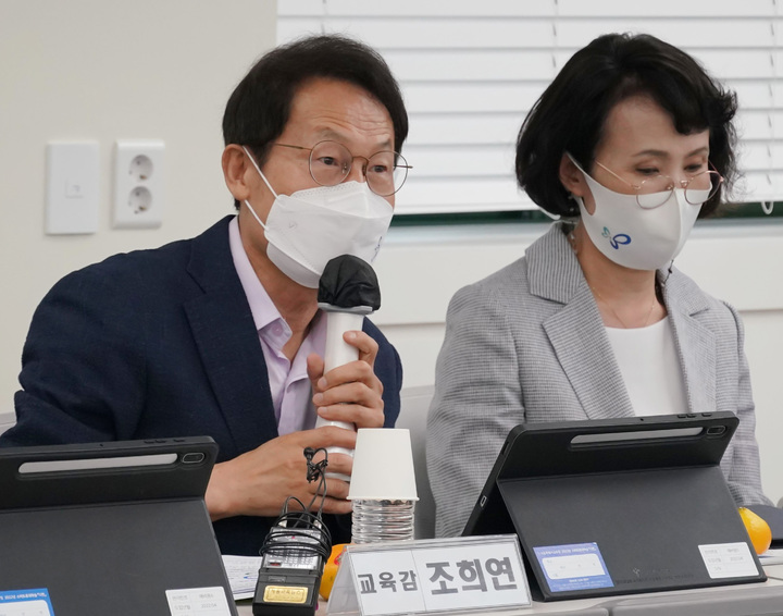 [서울=뉴시스] 김진아 기자 = 조희연 서울시교육감이 13일 오후 서울 동작구 상도중학교에서 탐구 기반 쓰기 수업·평가모델인 '생각을 쓰는 교실 수업'을 참관 후 간담회를 하고 있다. (사진=서울시교육청 제공) 2022.07.13. [email protected] *재판매 및 DB 금지