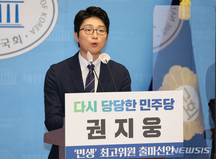 [서울=뉴시스] 최진석 기자 = 권지웅 전 더불어민주당 비상대책위원이 14일 국회 소통관에서 민주당 최고위원 출마 선언 기자회견을 하고 있다. (공동취재사진) 2022.07.14. [email protected]
