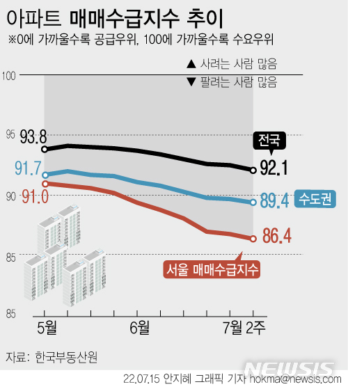 [서울=뉴시스] 15일 한국부동산원에 따르면 이번주(11일 기준) 서울 아파트 매매수급지수는 86.4로 지난주(86.8)보다 0.4포인트(p) 하락했다. 10주째 이어지는 하락세다. 사상 첫 '빅스텝'(기준금리 0.5%포인트 인상)으로 금리가 연이어 인상된 데다 집값 고점인식이 계속되면서 매수자들의 관망세도 길어지는 모양새다. (그래픽=안지혜 기자)