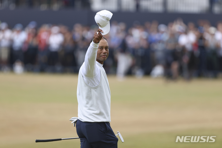 [스코틀랜드=AP/뉴시스] 타이거 우즈(미국)가 15일(현지시간) 영국 스코틀랜드의 세인트 앤드루스 GC 올드코스에서 열린 브리티시 오픈 제150회 디 오픈 챔피언십 2라운드 경기를 마치고 인사하고 있다. 우즈는 중간 합계 9오버파 153타로 컷 탈락했다. 2022.07.16.