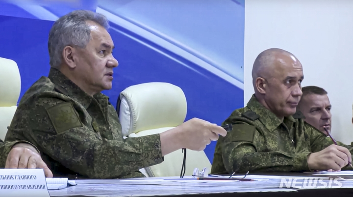 [모스크바=AP/뉴시스] 러시아 국방부가 16일(현지시간) 공개한 사진에 세르게이 쇼이구(왼쪽) 러시아 국방장관이 위치가 알려지지 않은 곳에서 회의 중 발언하고 있다. 쇼이구 장관은 "우크라이나 정부가 돈바스 지역을 비롯한 러시아 점령 지역의 민간 시설을 로켓포와 각종 무기로 폭격하지 못하게 하도록 총공격을 지시했다"라고 밝혔다. 2022.07.17.