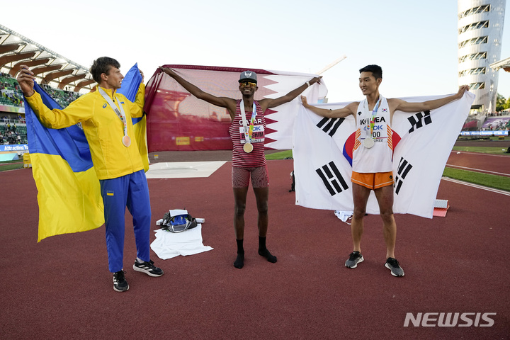 [유진=AP/뉴시스] 우상혁(오른쪽)이 18일(현지시간) 미 오리건주 유진의 헤이워드 필드에서 열린 세계육상선수권대회 남자 높이뛰기 시상식에서 은메달을 목에 걸고 포즈를 취하고 있다. 우상혁은 결선에서 2m35를 넘어 한국 육상 높이뛰기 최초로 세계선수권 은메달을 목에 걸었다. 금메달은 2m37을 넘은 무타즈 에사 바심(카타르)이 차지해 세계선수권 3연패를 달성했다. 2022.07.19.
