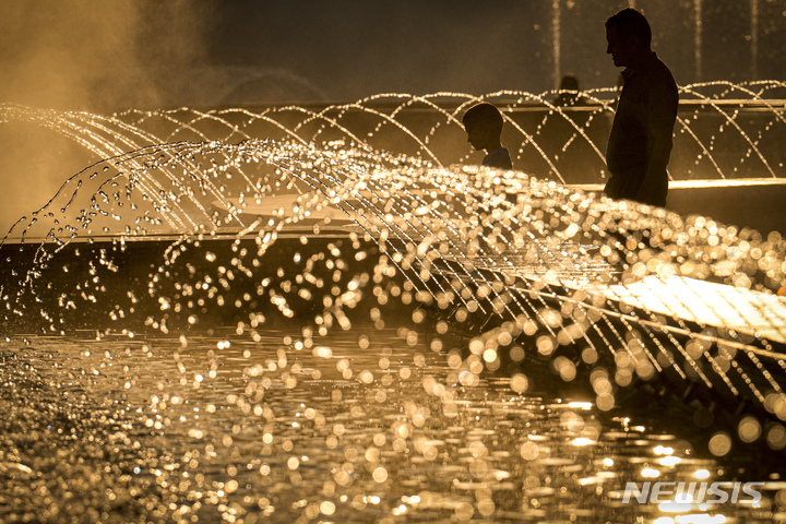 [부쿠레슈티=AP/뉴시스] 20일(현지시간) 해 질 녘 루마니아 부쿠레슈티의 분수대에서 한 남성이 아이와 함께 더위를 식히고 있다. 루마니아 기상청은 전역에 며칠 동안 폭염이 이어질 것이라고 예보했다. 2022.07.21.