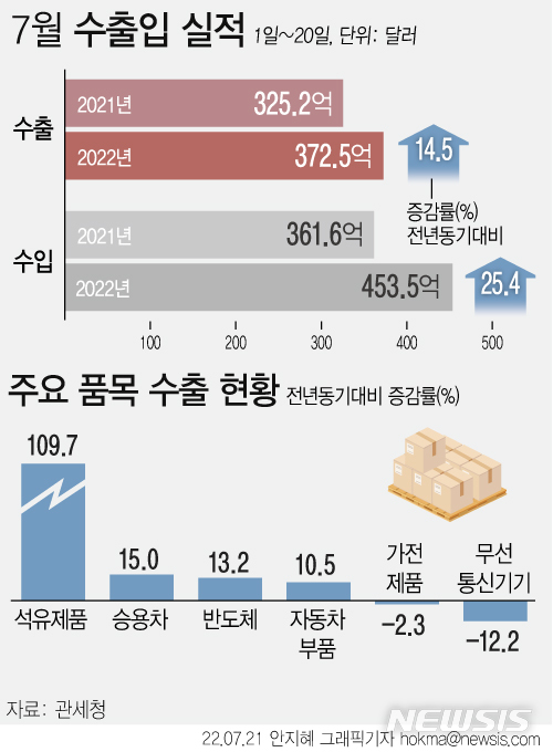 [그래픽] 7월 1~20일 수출 14.5% 증가…무역적자는 81억 달러