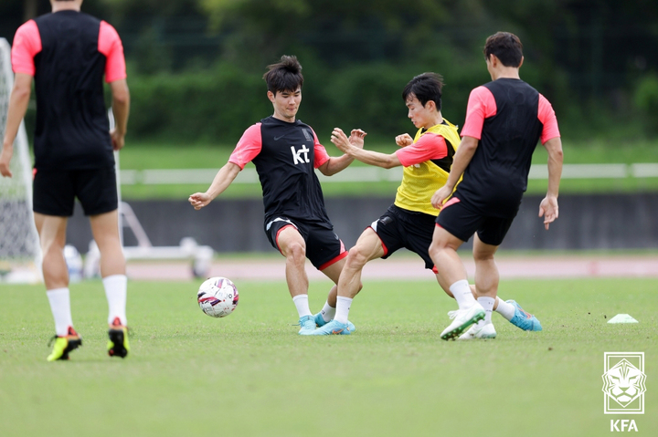 [서울=뉴시스] 2022 EAFF E-1 챔피언십에 출전한 축구대표팀 김진규, 김문환이 21일 일본 아이치현 도요타 시티 스포츠 파크 어슬레틱스T&F에서 훈련을 하고 있다. (사진=대한축구협회 제공) 2022.07.21. [email protected] *재판매 및 DB 금지