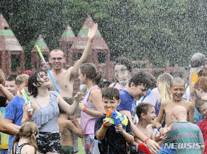 [제네바=AP/뉴시스] 24일(현지시간) 미 오하이오주 제네바의 메모리얼 필드에서 연례 제네바 물싸움이 열려 어린이들이 쏟아지는 물을 맞으며 즐거워하고 있다. 행사 동안 소방차들이 수백 명의 참가자에게 물을 뿌려 시원함을 선사한다. 2022.07.25.