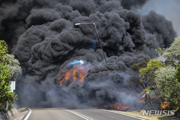 [크레스테나=AP/뉴시스] 24일(현지시간) 그리스 고대 올림피아 인근 크레스테나 마을에서 발생한 산불이 도로변 전력선에 옮겨붙으며 전기불꽃이 튀고 있다. 그리스 전역에서 최소 6건의 화재가 더 발생해 소방 당국은 이 지역을 비롯한 인근 5개 마을 주민을 긴급히 대피시켰다. 2022.07.25.