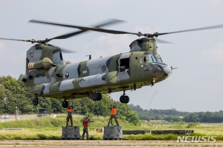 [서울=뉴시스] 사진공동취재단 = 지난 25일 경기 이천시 육군항공사령부에서 열린 대규모 항공작전 훈련에서 CH-47D 시누크 헬기가 전력 물자 공급을 위한 공중강습작전을 하고 있다. 2022.07.26. [email protected]
